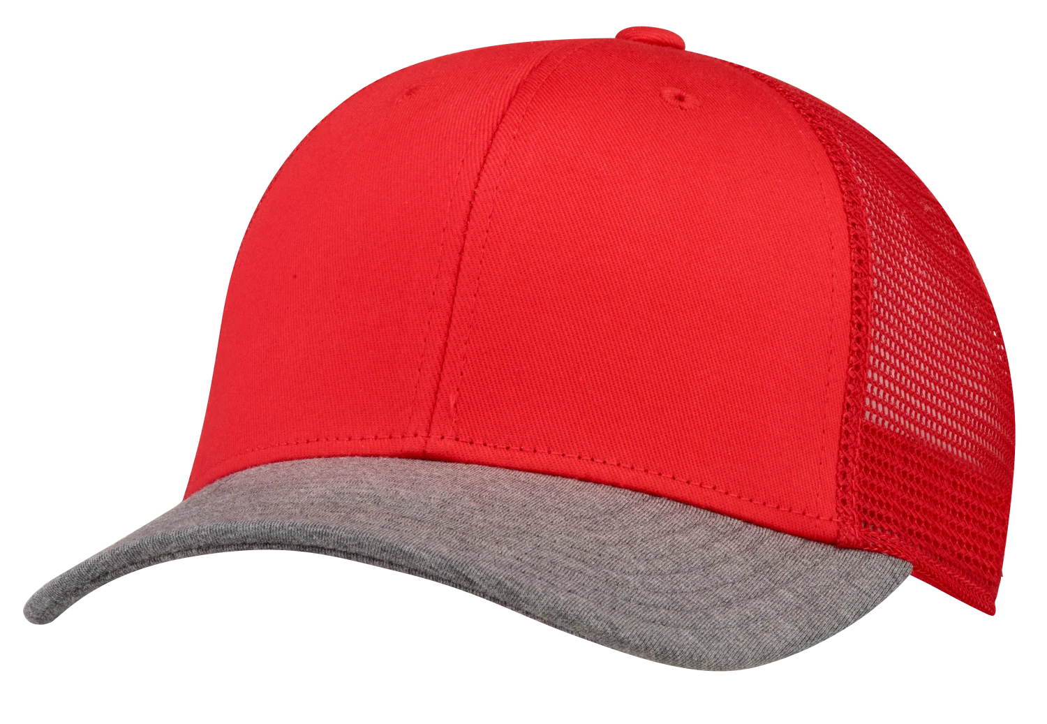 Structured mid-crown trucker cap with washed-cotton front panels and mesh back panels. Adjustable snap closure.